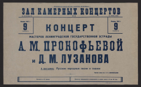 Концерт мастеров Ленинградской государственной эстрады А.М. Прокофьевой и Д.М. Лузанова, Январь 1943 г., 9 Суббота : [афиша] / Управление по делам искусств Исполкома Ленгорсовета, Зал камерных концертов