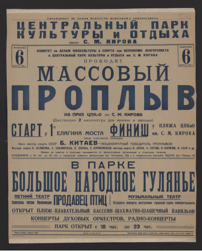 Визуальный материалВоскресенье 6 августа 1944 г. Комитет по делам физкультуры и спорта при Исполкоме Ленгорсовета и Центральный парк культуры и отдыха им С.М. Кирова проводят массовый проплыв на приз ЦПКИо им. С.М. Кирова. (Дистанция 2 километра для мужчин и женщин). Старт у 1-го Елагина моста финиш у пляжа ЦПКиО им. С.М. Кирова. Среди участников проплыва: Засл. мастер спорта СССР Б. Китаев - неоднократный победитель проплывов. Мастера спорта: Е. Белякова, З. Заклинская, Л. Зубова, Е. Коряковская; мастера спорта П. Агеев, О. Гертик, П. Корягин, П. Саар и др. Заявки на участие в проплыве принимаются от физкультурных организаций и отдельных пловцов. Ежедневно с 10 час. до 20 час. в городском комитете физкультуры и плавательном бассейне ВЦСПС : [афиша] / Управление по делам искусств Исполкома Ленгорсовета, Центральный парк культуры и отдыха им С.М. Кирова1944Онлайн доступ:Электронная копия Наличие: Click here to access online | :