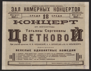 Визуальный материалИюль 1943 г., 5 понедельник, 11 воскресенье. Спектакли Театра Краснознаменного Балтийского Флота. Эдмон Ростан. Сирано де-Бержерак : героическая комедия в 5 действиях. Перевод Вл. Соловьева. Постановка В.Н. Соловьева (орд.). Художник - Г.В. Аскинази. Сценическая редакция - Е.В. Аскинази. Композитор - В.Л. Витлин. Роль Сирано де-Бержерак исполняет Заслуж. арт. РСФСР В.И. Честноков. Участвуют: Е.В. Аскинази, А.В. Дельвин, М.Ф. Мамкина [и др.]. Ведет спектакль - А.И. Первертень. Музыкальное сопровождение - М.И. Полянский. Костюмы выполнены - Е.А. Шибинской и П.Л. Материковой. Грим и парики - Г.Д. Павлов. Свет - Д.И. Анастасьевич. Художественный руководитель театра - Засл. арт. РСФСР А.В. Пергамент (орд.) : [афиша] / Управление по делам искусств Исполкома ЛенгорсоветаТеатр Краснознаменного Балтийского флота1943Онлайн доступ:Электронная копия Наличие: Click here to access online | :