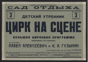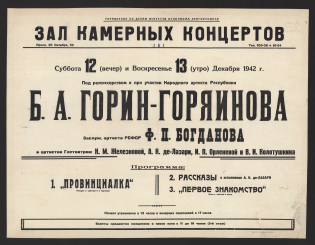 Визуальный материал7 и 12 Октября при участии заслуженного артиста РСФСР Афанасьева М.И. Машенька: пьеса А. Афиногенова в 3-х действиях, 7 картинах. Постановка заслуженного артиста РСФСР Гуревич Г.Н. 8 и 9 Октября. Кто смееется последний: пьеса лауреата Сталинской премии Крапива в 3-х актах, 7 картинах. Постановка заслуженного деятеля искусств Чарова Н.И. В возобновлении Евдонова Н.Н. 10-11 Октября при участии заслуженного артиста РСФСР Афанасьева М.И. Шутники: картины московской жизни А.Н. Островского, в 3-х действиях. Постановка Колобова С.И. Состав труппы: Афанасьев М.И. (засл. арт. РСФСР), Борисова Т.А., Верховская Н.Д. [и др.]. Директор и худ. рук. С.И. Колобов. Зам. дирек. А.Ф. Кувшинов. Режиссер Н.Н. Евдонов. Зав. муз. частью М.М. Кононович. Гл. администр. И.Н. Куликов : [афиша] / Управление по делам искусств при Исполкоме Леноблсовета депутатов трудящихся, Ленинградский областной реалистический театр в помещении Театра управления по делам искусств пр. Володарского, 51[1941]Онлайн доступ:Электронная копия Наличие: Click here to access online | :