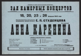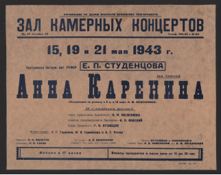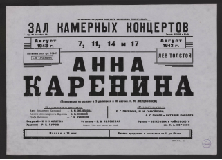Визуальный материал 15, 19 и 21 мая 1943 г. Постановка Заслуж. арт. РСФСР Е.П. Студенцова. Лев Толстой. Анна Каренина : (композиция по роману в 3 д. и 10 карт. Н.М. Железновой) : в главных ролях Анны Аркадьевны Карениной - Н.М. Железнова, Алексея Александровича Каренина - И.П. Новский, Графа Вронского - Г.К. Кузнецов : участвуют: Е.Г. Гаршина, М.Н. Самойлова и А.С. Пикар : ведущий - И.И. Малятов, художник - Р.И. Гуров, от автора - В.В. Яблонская (лауреат I Лен. конк. маст. худож. слова), музыка Бетховена и Чайковского, составл. проф. А.Д. Каменским, исп. В.М. Литцанский : [афиша] / Управление по делам искусств Исполкома Ленгорсовета, Зал камерных концертов 1943 Онлайн доступ: Электронная копия Наличие: