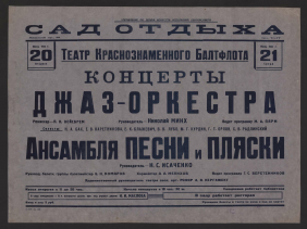 Визуальный материал Концерты джаз-оркестра, Август 1944 г., 7, понедельник, 8, вторник, 9, среда. Режиссер П. К. Вейсбрем. Руководитель Николай Минх. Солисты: О. М. Нестерова, Т. А. Таубе, Е. В. Каретникова [и др.]. Артисты джаз-оркестра: Абрамов Н., Атлас И. (концертмейстер), Денисов И. [и др.]. Художественный руководитель театра засл. артист РСФСР А. В. Пергамент : [афиша] / Управление по делам искусства Исполкома Ленгорсовета, Сад отдыха (Закрытый летний театр), Театр Краснознаменного Балтийского флота Театр Краснознаменного Балтийского флота. Джаз-оркестр 1944 Онлайн доступ: Электронная копия Наличие: