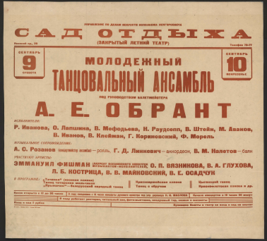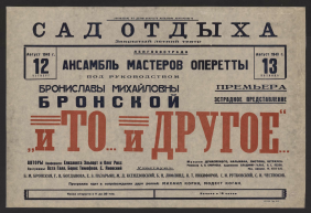 Визуальный материал Премьера, Август 1943 г., 13 пятница : ансамбль мастеров оперетты под руководством Брониславы Михайловны Бронской. "И то... и другое" : эстрадное представление : авторы конферанса: Елизавета Эльпорт и Олег Рисс. Программы: Аста Галл, Борис Тимофеев, Е. Яновский. Музыка: Дунаевского, Кальмана, Листова, Штрауса. Режиссер А.В. Смирнов. Художники: Владимир Гальб, В.С. Пехов. Муз. оформл. М. Коган : участвуют: Б.М. Бронская, Г.В. Богданова, Е.Э. Назарьян [и др.]. Программа идет в сопровождении двух роялей: Михаил Корик, Модест Коган : [афиша] / Управление по делам искусств Исполкома Ленгорсовета, Сад отдыха, Закрытый летний театр, Ленгорэстрада 1943 Онлайн доступ: Электронная копия Наличие: