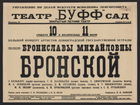 Визуальный материал Большой концерт артистов Ленинградской государственной Эстрады, суббота 10 и воскресенье 11 июля [1943 г.] : при участии: Бониславы Михайловны Бронской, 2 Больварс (крафт-жонглеры), Г.П. Васильева (солист балета), З. Дмитриевой (солистка балета), М.Э. Левицкой (детские рассказы), Д.М. Лузанова (худож. чтение), В.Т. Никифорова (пение), М.М. Пилляр (иллюзион), А.М. Прокофьевой (русские народные песни) и С.И. Рутковского. Партию рояля исполняют Е.Ф. Рославлева и М.М. Коган. Конферансье М.М. Волжский : [афиша] / Управление по делам искусств Исполкома Ленгорсовета, Театр "БУФФ" , Закрытый летний театр Ленинградская государственная эстрада [1943] Онлайн доступ: Электронная копия Наличие: