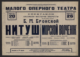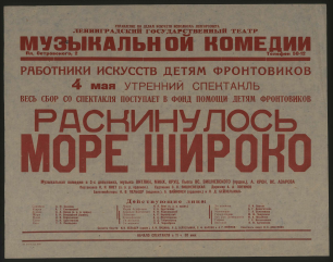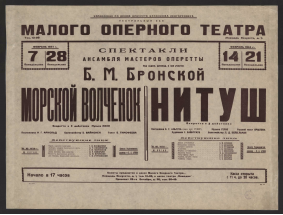 Визуальный материал Спектакли ансамбля мастеров оперетты. Под худож. руковод. и при участии Б.М. Бронской, февраль 1944 г., 7 понедельник, 28 понедельник. Морской волченок : оперетта в 3 действиях : музыка Женэ. Постановка А.Г. Арнольд. Балетмейстер Б. Вайнонен. Текст Б. Тимофеева : действующие лица: Мария, королева Аквитании Г.В. Богданова; Ломберто, адмирал Аквитанского флота В.Т. Никифоров; Домингос, министр С.И. Честноков; Донна Антония, жена министра Е.Э. Назарьян; Фаншетта, французская артистка Б.М. Бронская; Дон Январио, бразильский миллиардер С.И. Рутковский. Зав. муз. частью - М. Коган. Оркестр Радиокомитета - Дирижер - С.А. Аркин : [афиша] / Управление по делам искусств Исполкома Ленгорсовета, Театральный зал Малого оперного театра, Ленинградский ансамбль мастеров оперетты 1944 Онлайн доступ: Электронная копия Наличие: