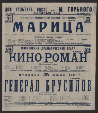 Визуальный материалЛенинградский Государственный Областной Театр Оперетты, Пятница 21 июля 1944 г. Э. Кальман. Марица : оперетта в 3-х действиях : текст Грекова К. и Хрона. Стихи Д.М. Цензора. Постановка засл. арт. РСФСР Дашковского Н.А. Режиссер-ассистент Грекова О.П. : действующие лица: Марица Валерская С.К.; Тасилло Лихновский Берлин Б.Я., Лентовский Л.Д.; Лиза, его сестра Грекова О.П., Фигнер Т.Е.; Коломан Зупан Сливинский Б.Д., Фисенко П.З.; Мориц Драгомир Артизаки Петровский И.А.; Карл Радунский Васильев В.А., Орэм Е.В.; Божена Лихновская Антонова О.К., Судьбинская Е.А.; Пенижек Белинский З.В.; Аза и цыганка Добринская; Илька Зуева. Балет: вальс - Додэ Е.С., Новер Ю.А., цыганский танец - Брайнина, Кондратьева, Тюльганова [и др.]. Дирижер: Аренков К.М. Балетмейстер: Новер Ю.А. Художественный руководитель театра заслуж. артист РСФСР Дашковский Н.А. : [афиша] / Дом культуры ВЦСПС им. М. Горького, Главный залЛенинградский государственный областной театр оперетты1944Онлайн доступ:Электронная копия Наличие: Click here to access online | :